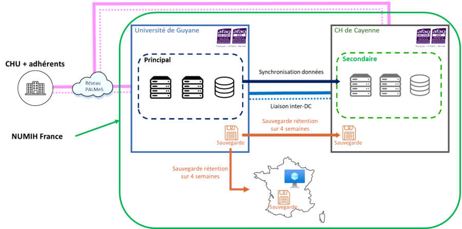 Le dispositif technique repose sur deux datacenters certifiés ISO2701 et HDS. Ils fonctionnent en miroir avec des mécanismes de réplication et de sauvegarde. Deux réseaux distincts assurent la connectivité : le réseau PALMeS (opérationnellement sous la responsabilité de Orange) et la liaison InterDC (sous la responsabilité de NUMIH France).